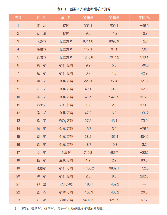 2019年,石油新增探明地质储量11.2亿吨,其中,新增探明技术可采储量1.6亿吨。页岩气新增探明地质储量 7644.2 亿立方米,其中,新增探明技术可采储量 1838.4 亿立方米。煤炭新增300.1亿吨,较上年明显下降。主要金属矿产中锰矿、铜矿、铅矿、锌矿、钨矿、钼矿、银矿等新增明显,铁矿、镍矿、锡矿、金矿明显下降。非金属矿产中磷矿、石墨明显增长。