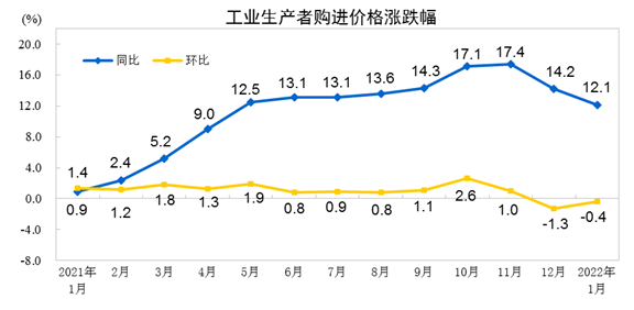 2022年1月份,全国工业生产者出厂价格同比上涨9.1%,环比下降0.2%;工业生产者购进价格同比上涨12.1%,环比下降0.4%。