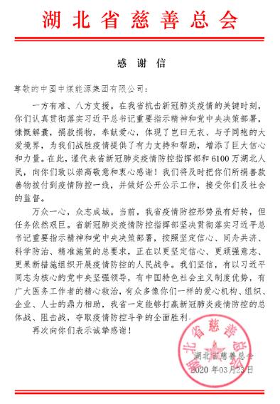 湖北省疫情防控指挥部、湖北省慈善总会致中煤集团感谢信