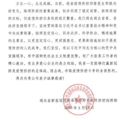 信中写道:在湖北省抗击新冠肺炎疫情的关键时刻,贵公司认真贯彻落实习近平总书记重要指示精神和党中央决策部署,慷慨解囊、奉献爱心,捐赠善款3000万元,体现了岂曰无衣、与子同袍的大爱情怀,体现了中央企业的铁肩担当和无私境界,为我们战胜疫情提供了有力支持和帮助,增添了巨大信心和力量。