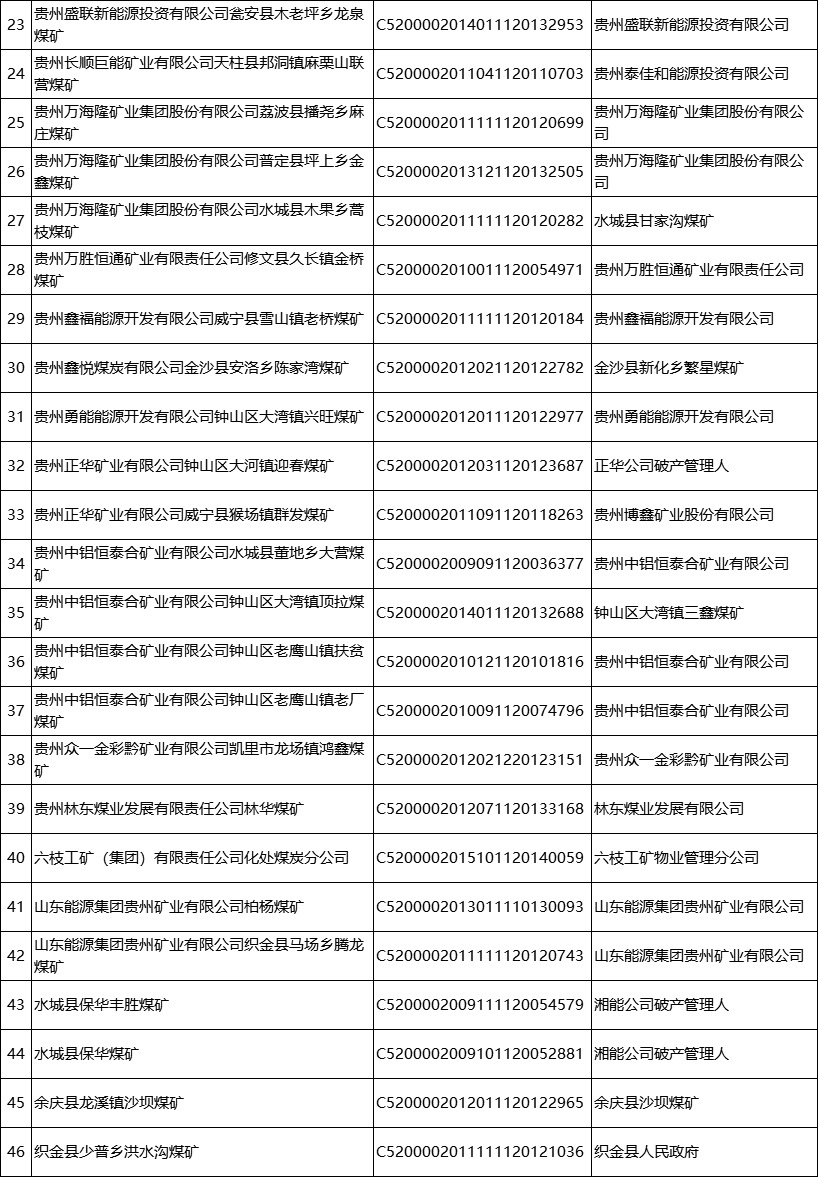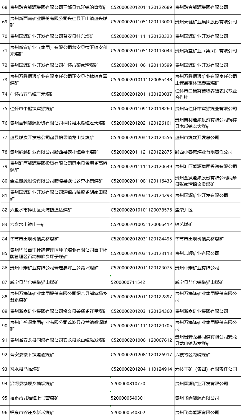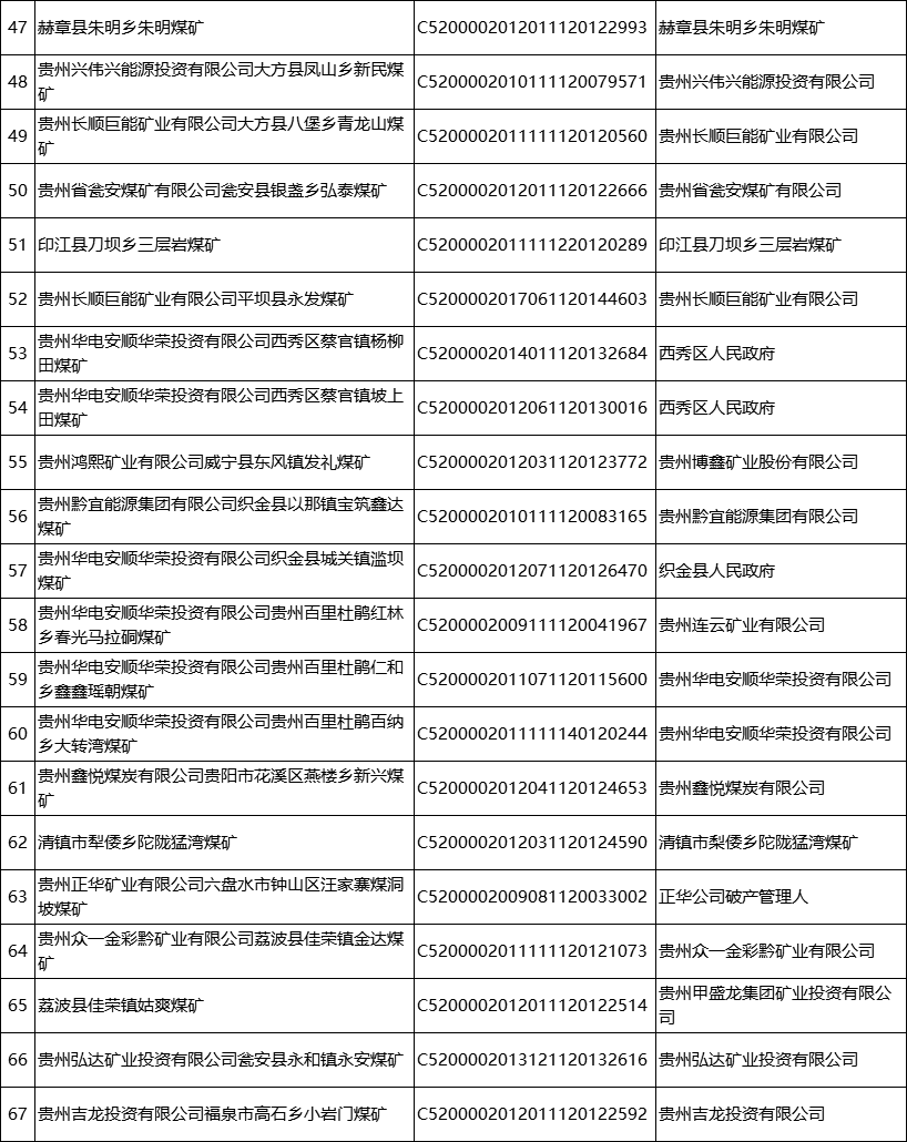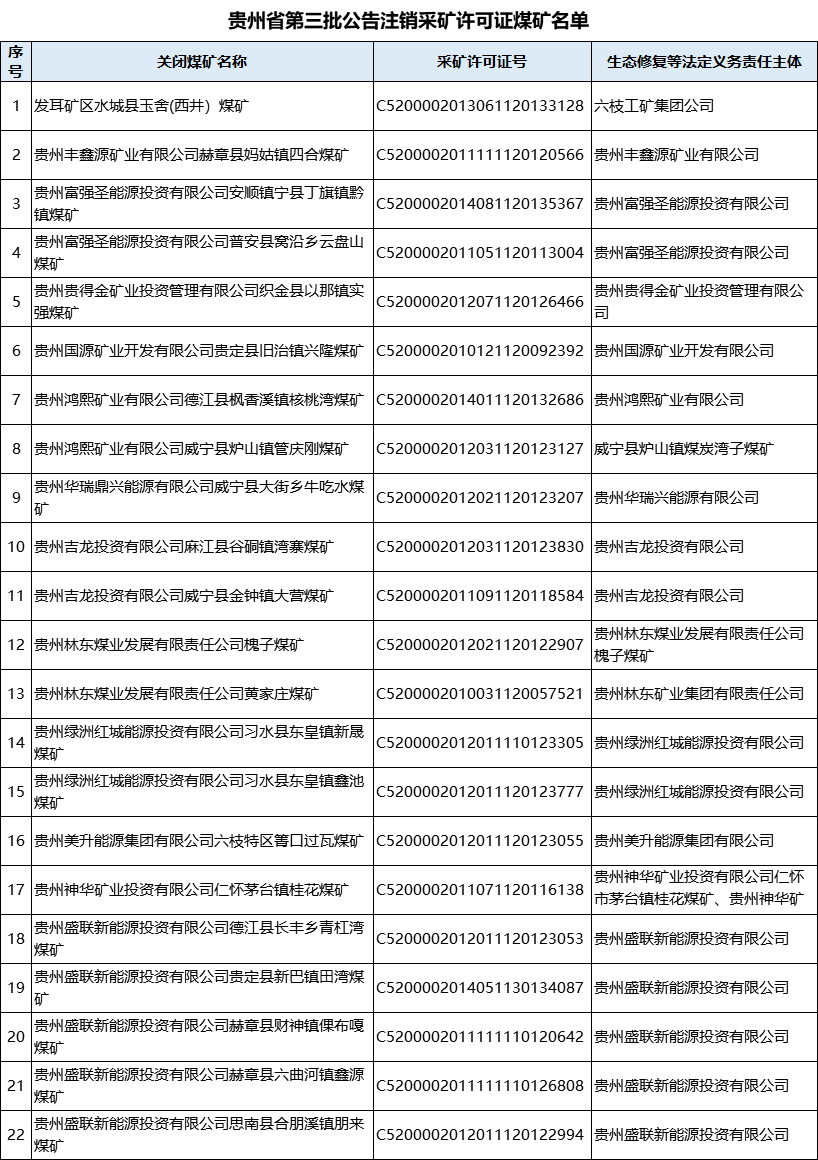 公告指出,根据《矿产资源开采登记管理办法》《国土资源部关于完善矿产资源开采审批登记管理有关事项的通知》《自然资源部办公厅关于政策性关闭矿山采矿许可证注销有关工作的函》《贵州省自然资源厅 贵州省能源局关于已关闭煤矿限期注销采矿许可证的公告》,对已按照《省人民政府关于煤炭工业淘汰落后产能加快转型升级的意见》(黔府发〔2017〕9号)、《省人民政府办公厅关于转发省能源局等部门贵州省煤矿企业兼并重组工作方案(试行)的通知》(黔府办发〔2012〕61号)要求完成关闭的发耳矿区水城县玉舍(西井)煤矿等96个煤矿予以注销采矿许可证并公告,责任主体要履行矿山关闭后相关生态修复等法定义务,对于未按承诺完成法定义务的纳入失信联合惩戒。