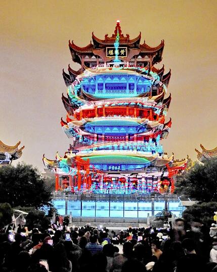 △10月7日晚,来自全国各地的抗疫英雄、游客及武汉市民在黄鹤楼前观看大型实景光影秀《夜上黄鹤楼》