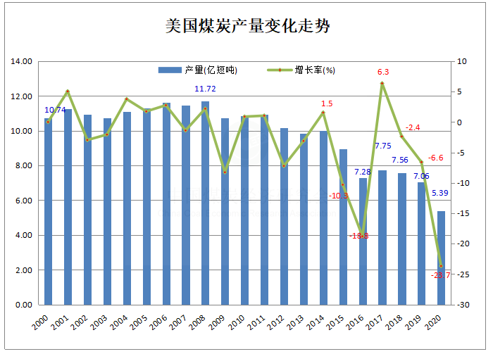 另据上月末美国能源信息署(EIA)发布的能源论评( Monthly Energy Review)报告数据显示,2020年美国煤炭产量为5.39亿短吨(约合4.89亿吨),首次跌破5亿吨,同比减少1.67亿短吨,下降23.7%。其中,12月份煤炭产量4643.6万短吨,同比下降12.7%。