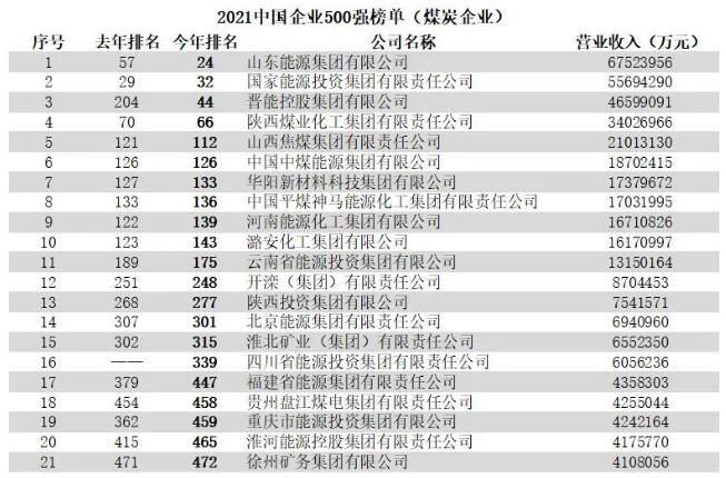 今年共有21家煤炭企业上榜。其中,山东能源集团有限公司、国家能源投资集团有限责任公司、晋能控股集团有限公司、陕西煤业化工集团有限责任公司入围榜单前100名。四川省能源投资集团有限责任公司为新上榜企业。有8家企业排名较去年有所提升,11家企业排名下降,1家企业排名持平。
