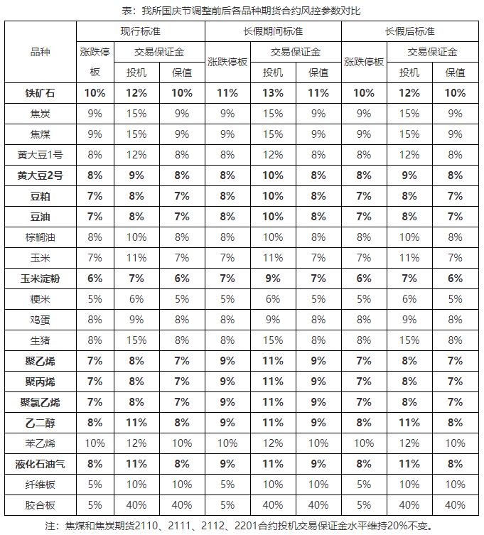根据《大连商品交易所风险管理办法》,经研究决定,我所将在2021年国庆节休市前后对各品种期货合约涨跌停板幅度和交易保证金水平做如下调整: