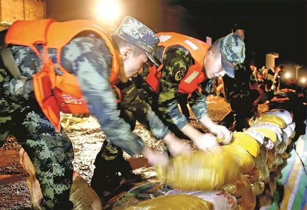 汾河新绛段抗洪一线,武警官兵在抓紧加筑堤坝。