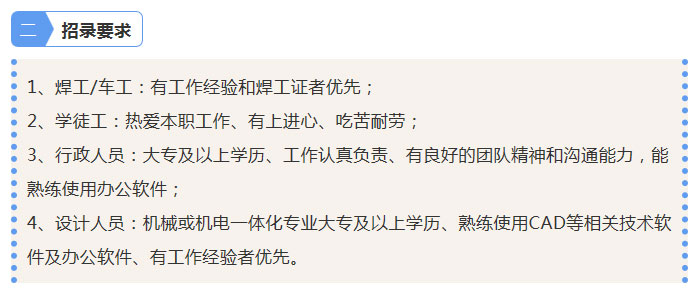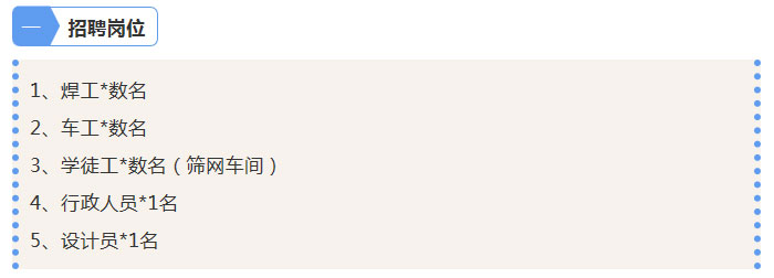 因公司扩大生产、新建大型车间,新增不锈钢筛网生产线,现面向社会招聘人才,具体如下: