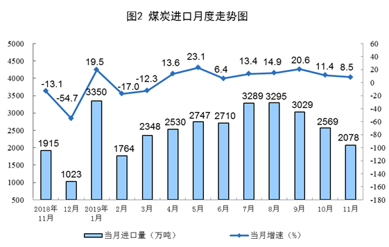 11月份,煤炭进口2078万吨,同比增长8.5%,增速比上月回落2.9个百分点。1—11月份,煤炭进口2.99亿吨,同比增长10.2%。
