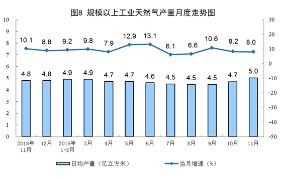 11月份,规模以上工业原煤、原油生产有所加快,天然气生产保持较快增长,电力生产平稳增长。