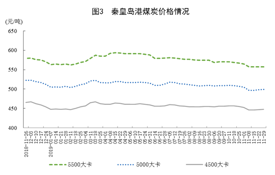 煤炭价格小幅下跌。11月29日,秦皇岛港5500大卡、5000大卡和4500大卡煤炭综合交易价格分别为每吨557元、499元和448元,比11月1日分别回落8元、6元和5元。