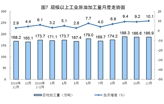 11月份,加工原油5608万吨,同比增长10.1%,增速比上月加快0.9个百分点;日均加工186.9万吨,环比增加0.3万吨。1—11月份,加工原油59318万吨,同比增长6.7%。