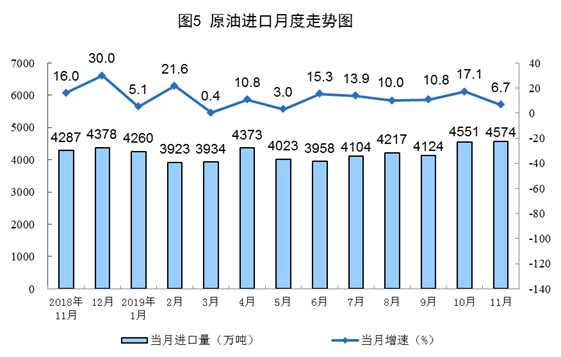 11月份,原油进口4574万吨,比上月增加23万吨,同比增长6.7%,增速比上月回落10.4个百分点。1—11月份,原油进口46188万吨,同比增长10.5%。