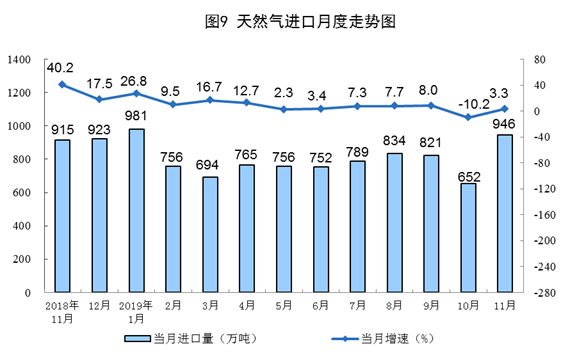 11月份,天然气进口946万吨,比上月增加294万吨,同比增长3.3%,而上月为下降10.2%。1—11月份,天然气进口8711万吨,同比增长7.4%。