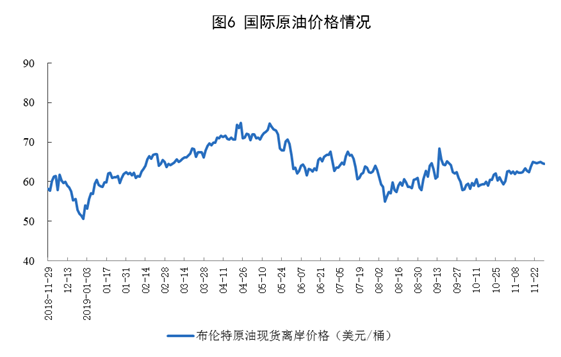 11月份,国际原油价格有所回升。11月29日,布伦特原油现货离岸价格为64.5美元/桶,比10月31日提高5.2美元。