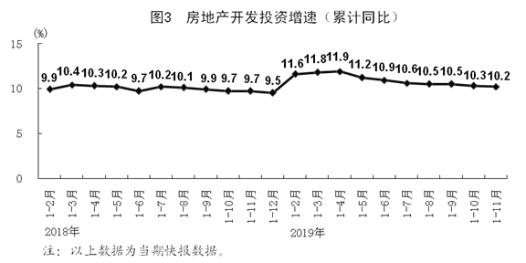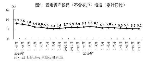 1-11月份,全国固定资产投资(不含农户)533718亿元,同比增长5.2%,增速与1-10月份持平。分领域看,基础设施投资同比增长4.0%,制造业投资增长2.5%,房地产开发投资增长10.2%。全国商品房销售面积148905万平方米,同比增长0.2%;商品房销售额139006亿元,增长7.3%。分产业看,第一产业投资下降0.1%,第二产业投资增长2.4%,第三产业投资增长6.7%。民间投资303786亿元,增长4.5%。1-11月份,高技术产业投资同比增长14.1%,快于全部投资8.9个百分点,其中高技术制造业和高技术服务业投资同比分别增长14.8%和13.1%。社会领域投资同比增长12.6%,快于全部投资7.4个百分点,其中教育,文化、体育和娱乐业投资分别增长17.5%和13.4%。生态?;ず突肪持卫硪?、环境监测及治理服务投资同比分别增长36.3%、30.6%,分别快于全部投资31.1、25.4个百分点。