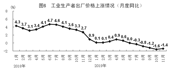 11月份,全国工业生产者出厂价格同比下降1.4%,降幅比上月收窄0.2个百分点,环比下降0.1%。工业生产者购进价格同比下降2.2%,环比下降0.1%。1-11月份,工业生产者出厂价格同比下降0.3%,工业生产者购进价格下降0.7%。