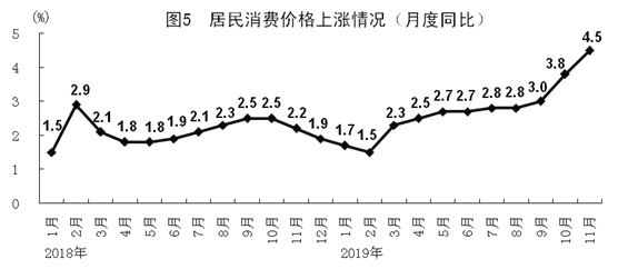 11月份,全国居民消费价格同比上涨4.5%,涨幅比上月扩大0.7个百分点;环比上涨0.4%,涨幅比上月回落0.5个百分点。分类别看,食品烟酒价格同比上涨13.9%,衣着上涨1.1%,居住上涨0.4%,生活用品及服务上涨0.4%,交通和通信下降2.8%,教育文化和娱乐上涨1.7%,医疗保健上涨2.0%,其他用品和服务上涨4.5%。在食品烟酒价格中,粮食价格上涨0.7%,猪肉上涨110.2%,鲜菜上涨3.9%,鲜果下降6.8%??鄢称泛湍茉醇鄹窈蟮暮诵腃PI上涨1.4%。1-11月份,全国居民消费价格同比上涨2.8%。