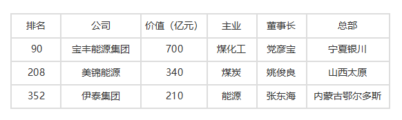 煤炭及相关领域共有3家企业上榜《2019胡润中国500强民营企业》。分别是宝丰能源集团以700亿元,排名第90位;美锦能源以340亿元,排名第208位;伊泰集团以210亿元,排名第352位。