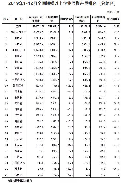 根据国家统计局最新公布数据显示,2019年全国原煤产量(规模以上口径,下同)37.5亿吨,比上年增长4.2%。