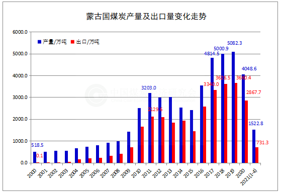 2021年1-4月蒙古国煤炭产量和出口分别增长70.4%和77.5%