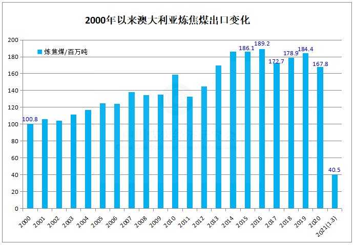 2021年一季度澳大利亚炼焦煤出口同比下降5%