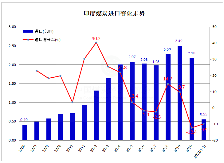 据印度mjunction平台初步统计数据显示,2020-21财年(2020年4月-2021年3月),印度煤炭进口2.16亿吨,比上一财年的2.47亿吨下降12.6%。其中,非炼焦煤进口1.41亿吨,比上一财年的1.7亿吨下降17.4%;炼焦煤进口4944万吨,比上一财年的4917万吨微增0.6%。2021年1-3月,印度煤炭进口5513万吨,比上年同期的61…