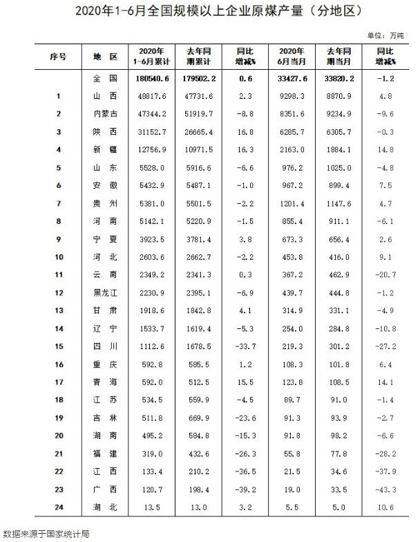 2020年上半年全国分省区原煤产量排名公布
