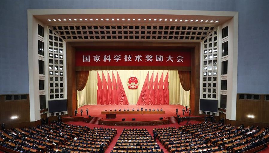 中共中央、国务院1月10日上午在北京隆重举行国家科学技术奖励大会。习近平、李克强、王沪宁、韩正等党和国家领导人出席大会并为获奖代表颁奖。在热烈的掌声中,中共中央总书记、国家主席、中央军委主席习近平首先向获得2019年度国家最高科学技术奖的原中国船舶重工集团公司第七一九研究所黄旭华院士和中国科学院大气物理研究所曾庆存院士颁发奖章、证书,同他们热情握手表示祝贺…